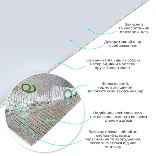 Самоклеющееся виниловое покрытие с фактурным рисунком под дерево и камень. Верхний прозрачный слой состоит из прочного ПВХ, за счет этого плитка обладает повышенной износостойкостью и не подвержена механическим повреждениям.