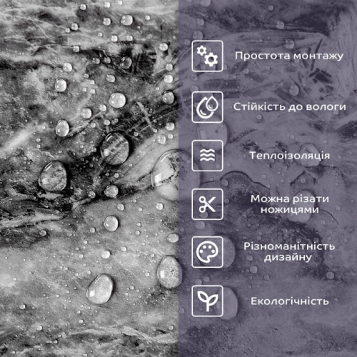 • 1. Легкость и прочность: плитка легкая и прочная, что упрощает ее логистику, установку и обеспечивает долгий срок службы. Материал легкий в установке, можно резать ножницами или монтажным ножом, не требует дополнительных материалов или специалистов. Между полосами не расходится, не раздувается и не деформируется. Процент обрези составляет 1%, что является лучшим показателем для настенных покрытий;