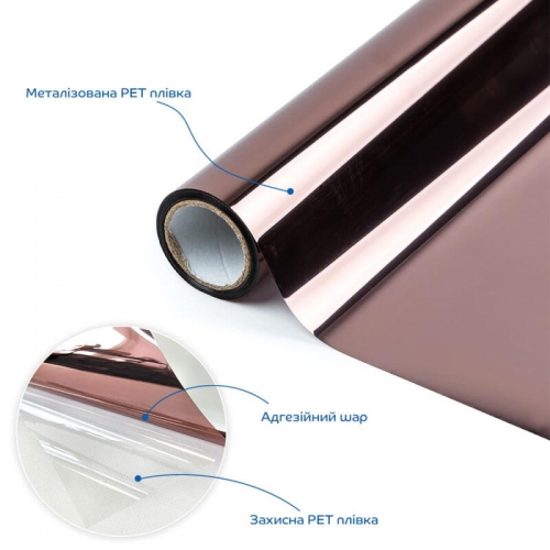 - Основной слой (PET с металлизацией): отвечает за зеркальный эффект, защиту от солнца и долговечность.