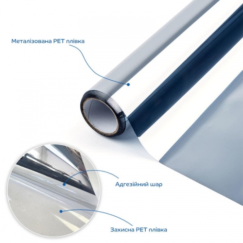 • Основной слой (PET с металлизацией): отвечает за зеркальный эффект, защиту от солнца и долговечность.