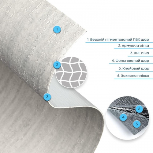 • Пигментированный ПВХ-слой — декоративная поверхность с высокой стойкостью к влаге, УФ-излучению и механическим воздействиям;