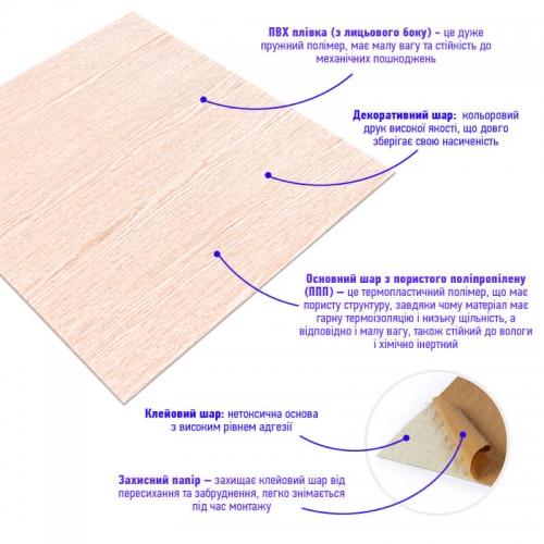 Як матеріал виробники використали спінений поліпропілен, а захисним шаром служить ПВХ. Полімер має пористу структуру, що дозволяє йому утримувати тепло, поглинати звуки, гасити вібрації. При цьому всім він залишається легким і простим у використанні. Сама ж структура самоклеючої декоративної 3D панелі закрита, а отже, має гідроізоляційні властивості.