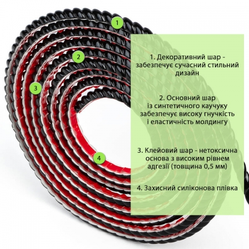 Самоклеючий молдинг — це гнучкий декоративний елемент з вбудованою клейовою основою, що дозволяє встановлювати його без додаткового клею чи інструментів. Завдяки еластичності матеріал легко повторює форму поверхні та підходить для оформлення стиків, кутів, стін, стель і меблів.