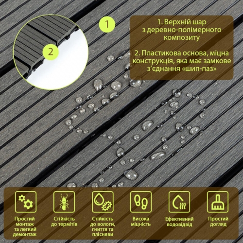 - Шар з деревинно-полімерного композиту: надає природний вигляд та міцність.