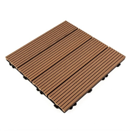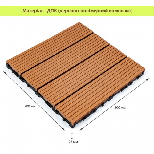 - Слой из древесно-полимерного композита: древесные волокна придают плитке натуральный вид и структуру, пластик же обеспечивает прочность и влагостойкость;