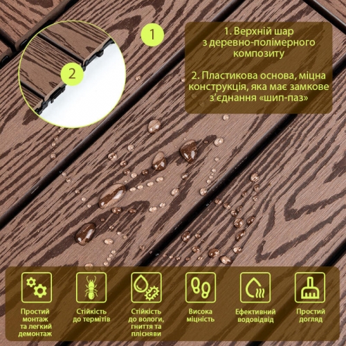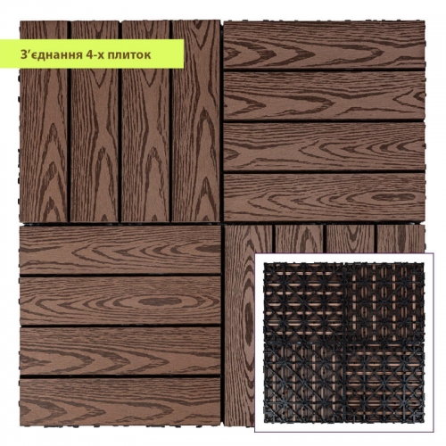 • Слой из древесно-полимерного композита: древесные волокна придают плитке натуральный вид и структуру, пластик же обеспечивает прочность и влагостойкость;